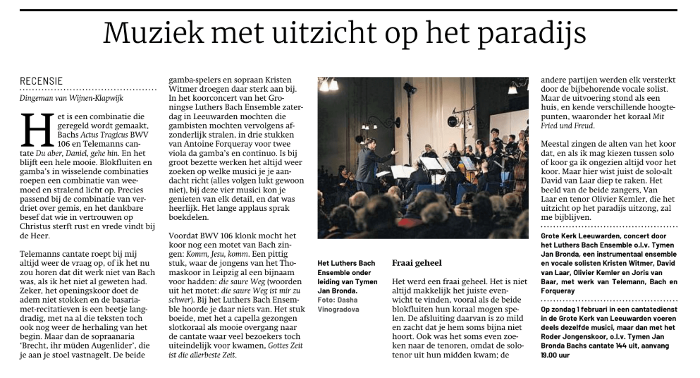 Luthers Bach Ensemble (kleinkoor, solisten en barokorkest) o.l.v. Tymen Jan Bronda