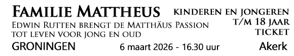 Verhoog aantal tickets van LBE - Familie Mattheus Passie - Edwin Rutten brengt de Matthäus Passion tot leven voor jong en oud - Groningen - Akerk - 6 maart 2026 - aanvang 16.30 uur - ticket kinderen en jongeren tot 18 jaar - zaal open 30 minuten voor aanvang concert