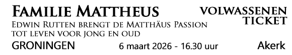 Verhoog aantal tickets van LBE - Familie Mattheus Passie - Edwin Rutten brengt de Matthäus Passion tot leven voor jong en oud - Groningen - Akerk - 6 maart 2026 - aanvang 16.30 uur - ticket volwassenen - zaal open 30 minuten voor aanvang concert
