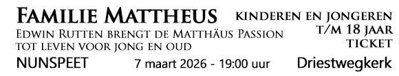 LBE – Familie Mattheus Passie – Edwin Rutten brengt de Matthäus Passion tot leven voor jong en oud – Nunspeet – Driestwegkerk – 7 maart 2026 – aanvang 19.00 uur – ticket kinderen en jongeren tot 18 jaar – zaal open 30 minuten voor aanvang concert